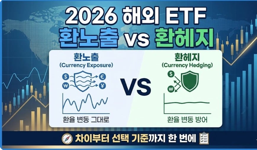 해외 ETF는 ‘기초자산 수익’에 ‘환율 효과’가 더해질 수 있어요. 환노출은 환율 변동을 그대로 받고, 환헤지는 환율 영향을 줄이려는 방식입니다. 개념